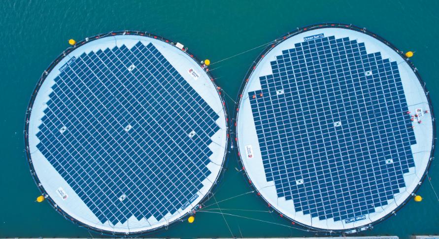 該項目位于山東省煙臺市海陽市南側(cè)海域,離岸30千米,水深30米。本次建設的500千瓦漂浮式海上光伏由兩個環(huán)形浮體單元組成,在直徑53米,面積相當于4個標準籃球場的浮體單元上,共安裝了770塊光伏組件。該項目驗證了浮體、錨固、發(fā)電組件抗風浪能力以及風光同場并網(wǎng)的技術可行性。